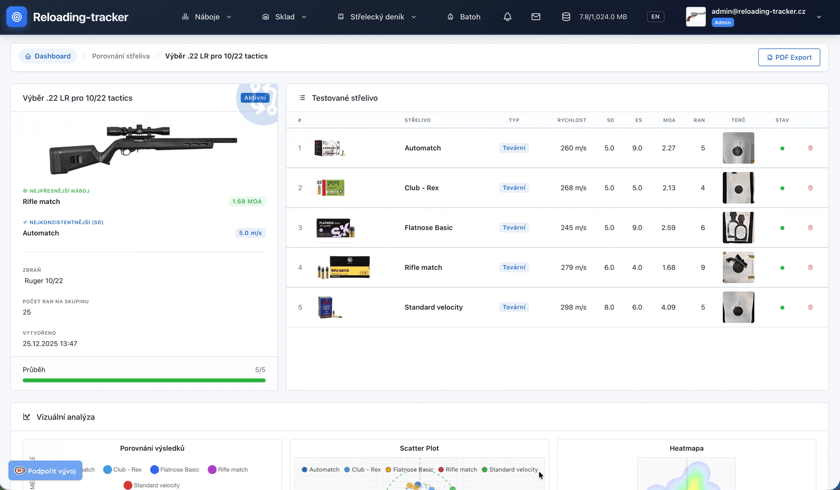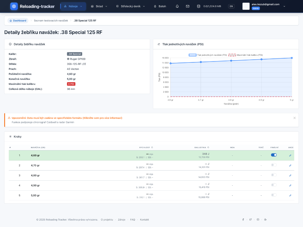 Sledování testovacích sérií, grafy tlaků a rychlostí. Najděte tu nejlepší kombinaci pro vaši hlaveň.