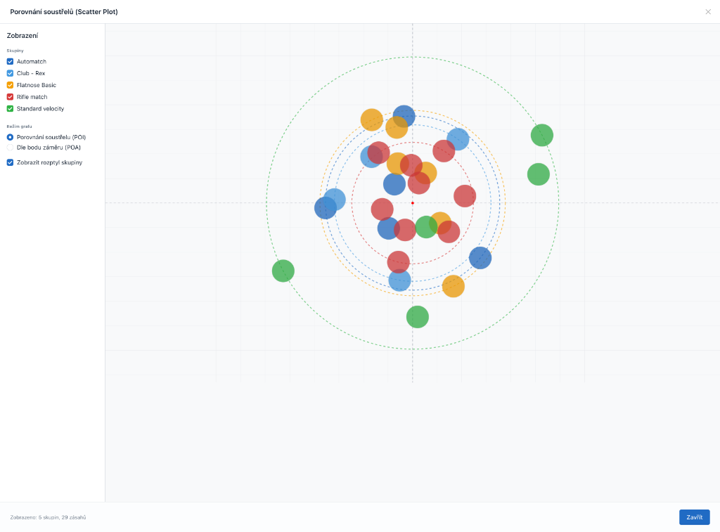 Interaktivní scatter ploty pro srovnání přesnosti různých navážek nebo typů střeliva přes sebe.